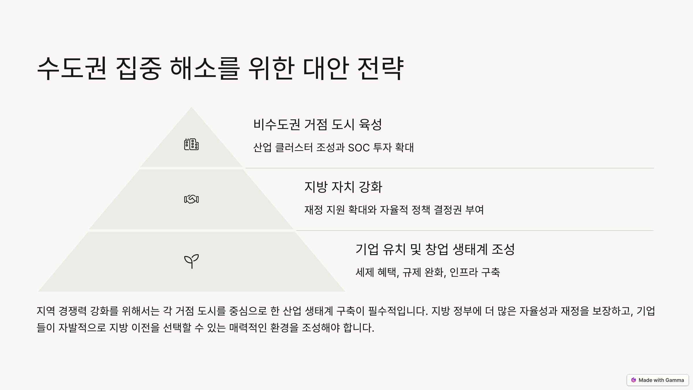 - 문화·교육 인프라: 문화, 의료, 교육 시설이 수도권에 집중되어 있어 지역 간 격차를 더욱 심화시킵니다.