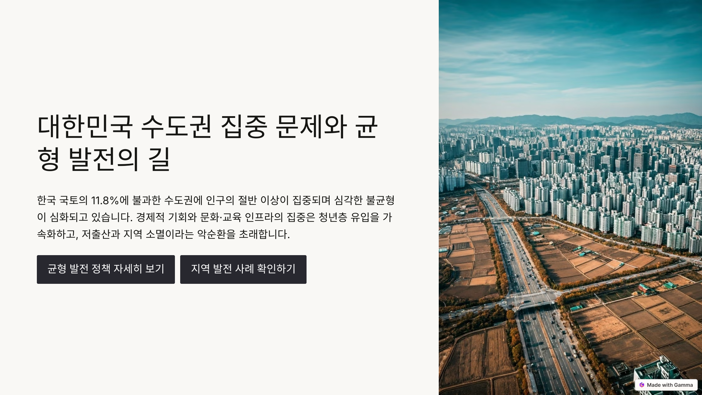 한국은 국토의 11.8%에 불과한 수도권에 인구의 절반 이상이 집중되어 있으며, 이는 경제적·사회적 불균형을 심화시키고 있습니다. 이러한 문제를 해결하기 위해 정부는 다양한 지역 균형 발전 정책을 추진해왔지만, 그 효과와 한계에 대한 논의는 여전히 진행 중입니다. 이번 글에서는 지역 균형 발전 정책의 현황과 수도권 집중 해소 가능성을 살펴보고, 실질적인 대안을 제시합니다.