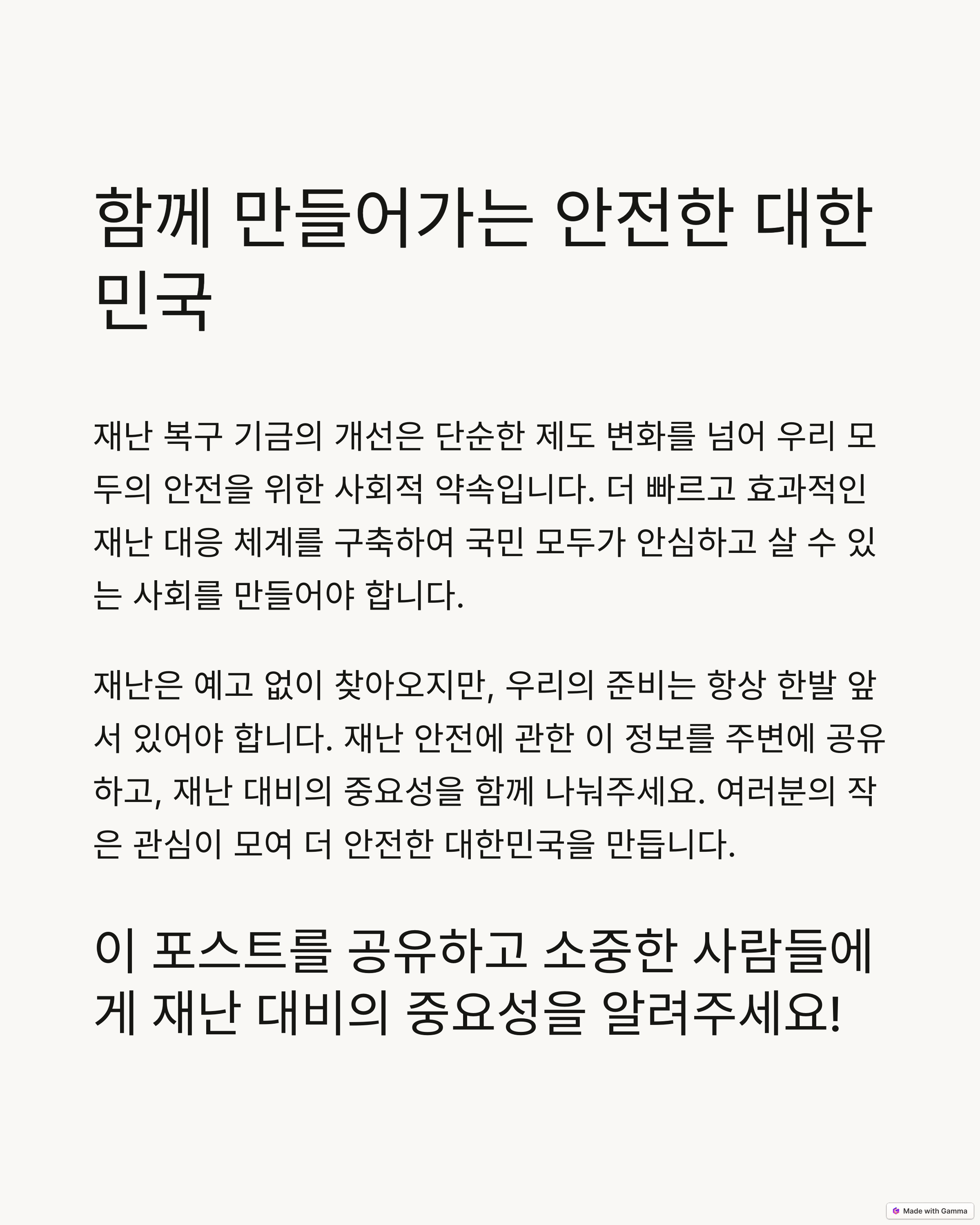 국가 재난 복구 기금은 국민의 생명과 재산을 보호하는 중요한 역할을 수행합니다. 하지만 현재의 운영 방식에는 여러 한계가 존재하며, 이를 개선하기 위한 노력이 필요합니다. 예방 중심의 투자, 지방정부 간 협력 강화, 투명성 확보, 디지털 기술 활용 등을 통해 더 효과적인 재난 관리 체계를 구축해야 할 것입니다.