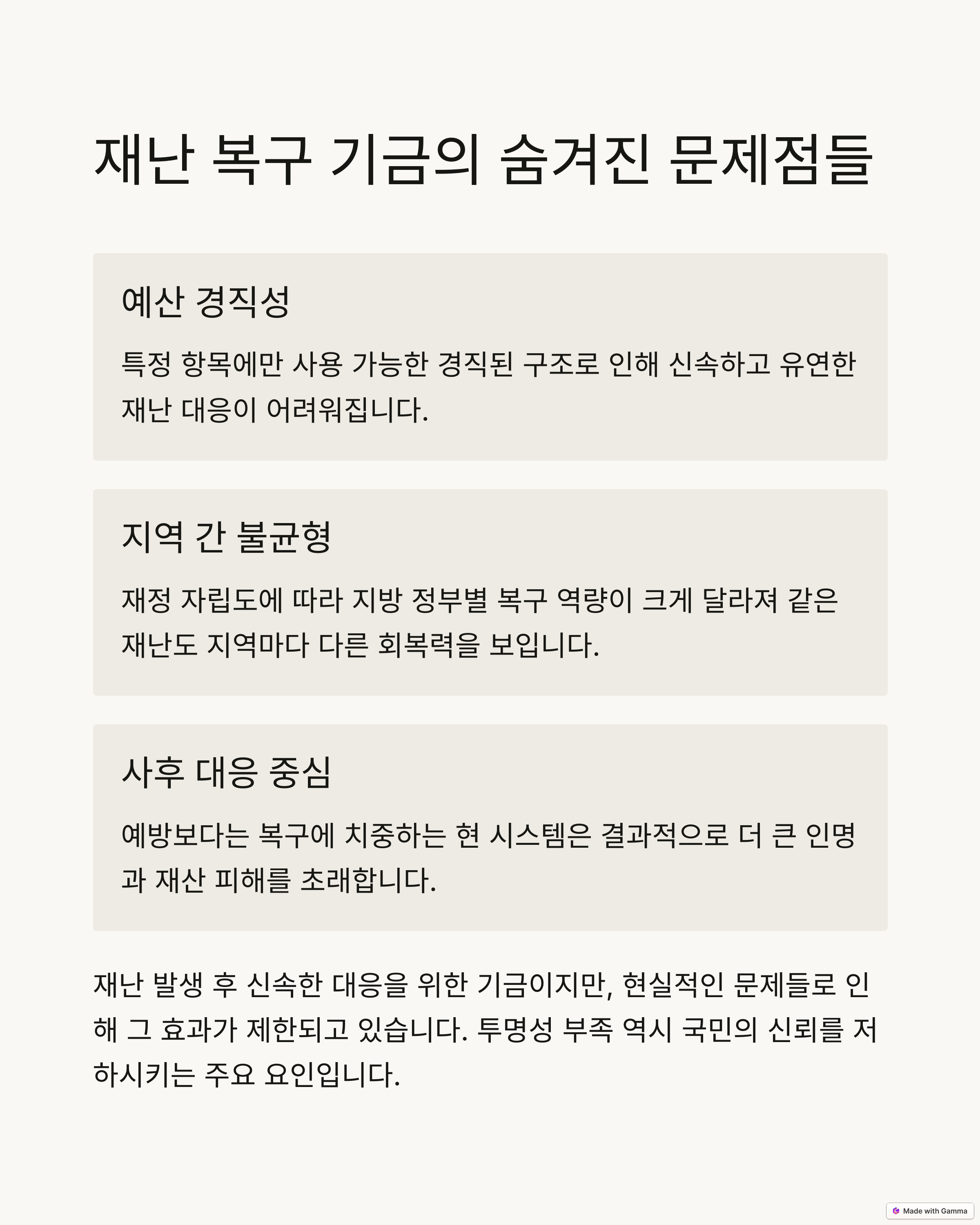 현행 국가 재난 복구 기금 시스템은 다음과 같은 한계를 가지고 있습니다: