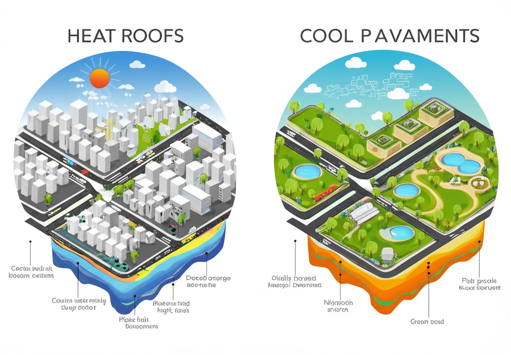 • 열 흡수 물질: 아스팔트와 콘크리트 같은 건축 자재는 열을 흡수하고 밤에 재방출하여 도시 온도를 높입니다.